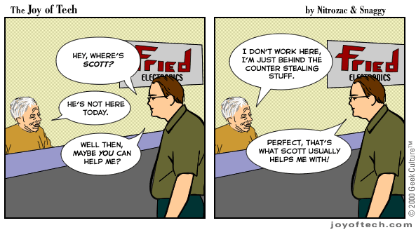 | Welcome to the Joy of Tech... by Nitrozac and Snaggy. It's a little bit simpler in style than our other comic After Y2K, and a little more topical. We hope you enJoy! |