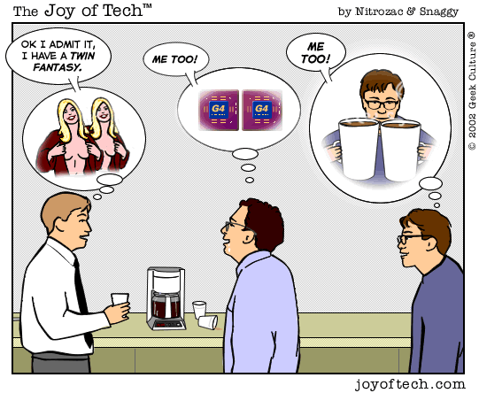 If you're using a Mac and a newer version of Explorer, here's a neat trick courtesy of MacMerc. Drag the above little image to the top tool bar of your browser, it should "stick" afterwards. Now you have a graphical link to the Joy of Tech, one that will update everytime a new comic is uploaded. If you need to delete or move it it, just Command/drag it around, or to the trash.